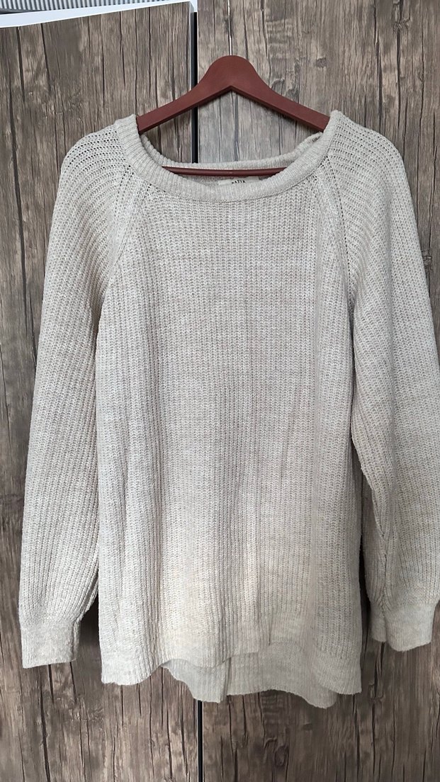 Gri renkli, keten kumaştan örülmüş, yuvarlak yaka ve uzun kollu rahat kesim kadın kazak. Günlük kullanım için uygundur.