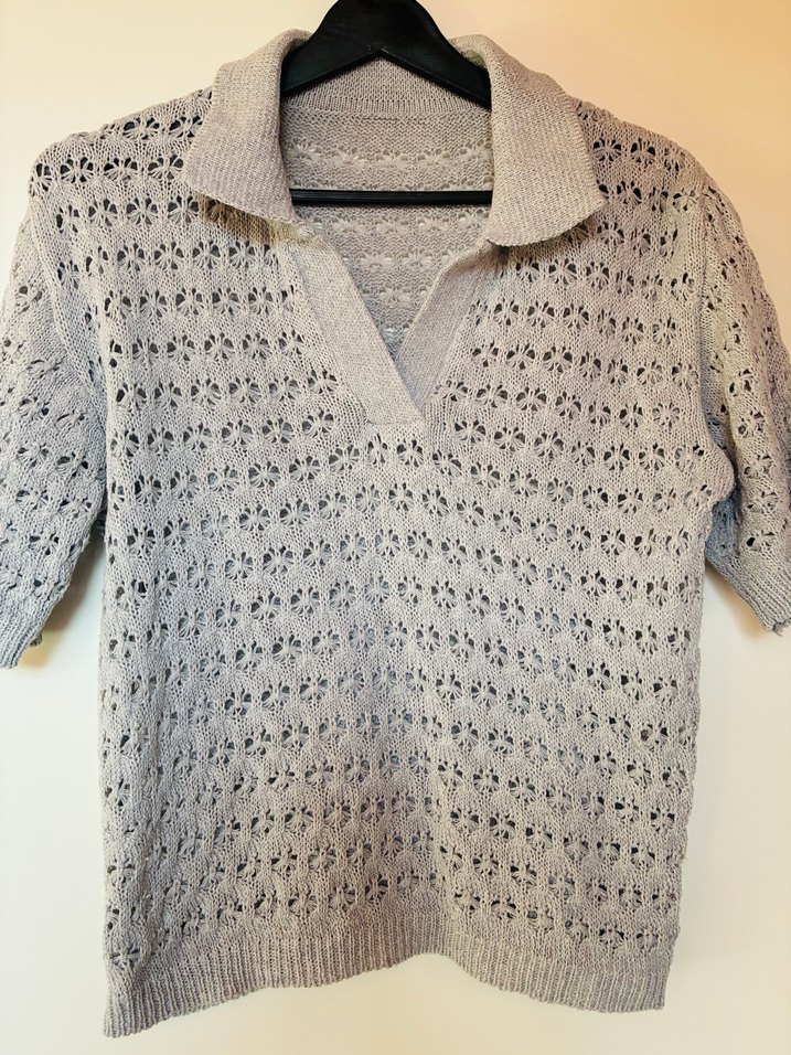 Gri renk, kısa kollu, yakalı ve örgü desenli kadın kazak. Rahat kesimiyle günlük kullanıma uygundur.