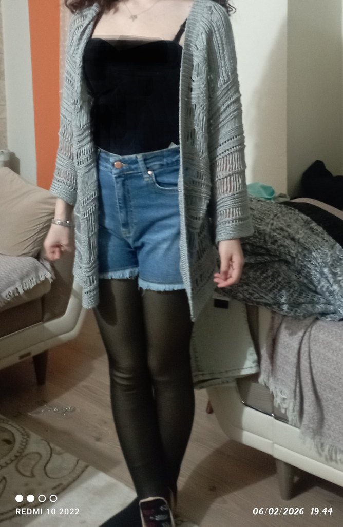Gri örgü kadın hırka, bol kesim, uzun kollu Normal midi boyda, desensiz ve günlük kullanım için uygundur.