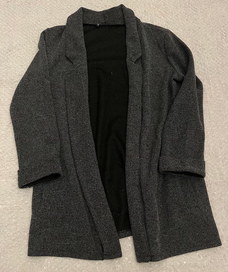 Gri renkli, örgü dokulu kadın blazer kesik yakalı ve uzun kolludur. Yün malzemeden olup, midi boy ve bol kesimdir, günlük rahat kullanıma uygundur.