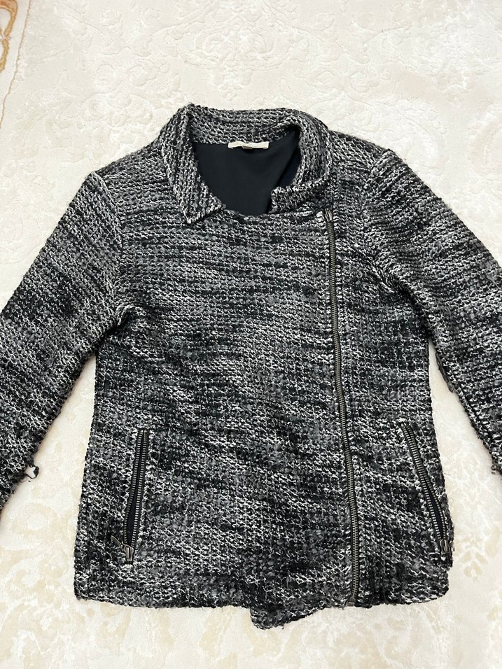 Fitted kesim, gri örgü yün kumaştan yapılmış, yakalı ve uzun kollu kadın midi ceketi. Fermuarlı ve normal uzunlukta, günlük kullanıma uygun sokak stili.