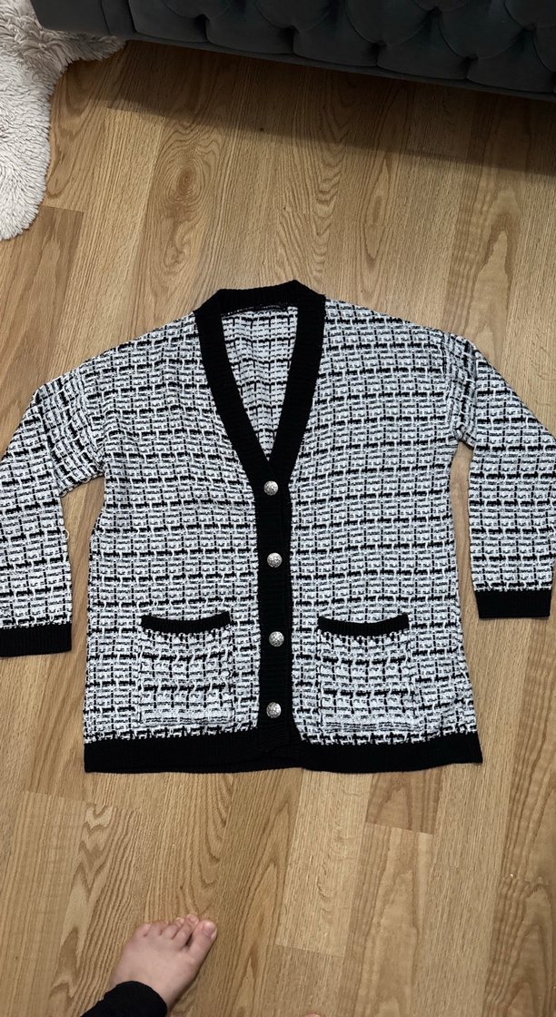 Gri örgü kadın hırka, uzun kollu, notched lapel yakalı ve düğmeli. Midi boyda, cep detaylı ve rahat kesimdir. Günlük kullanım için uygundur.