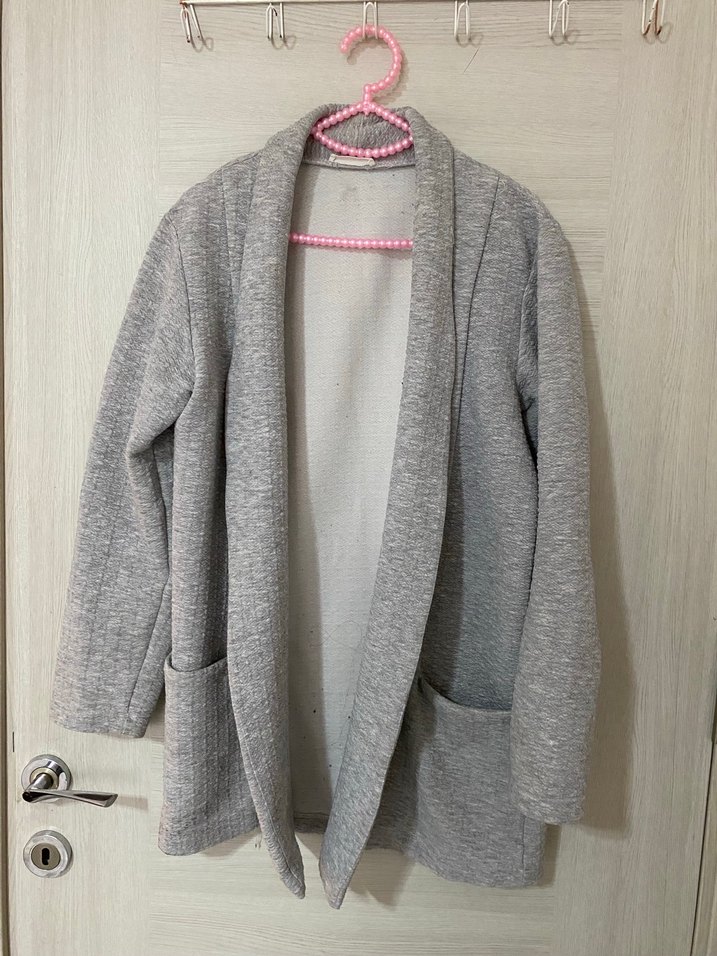 Gri renkte, örgü kumaştan yapılmış, diz boyu midi uzunluğunda, uzun kollu kadın kabanı. Rahat kesimi ve klasik yakasıyla günlük kullanıma uygundur.