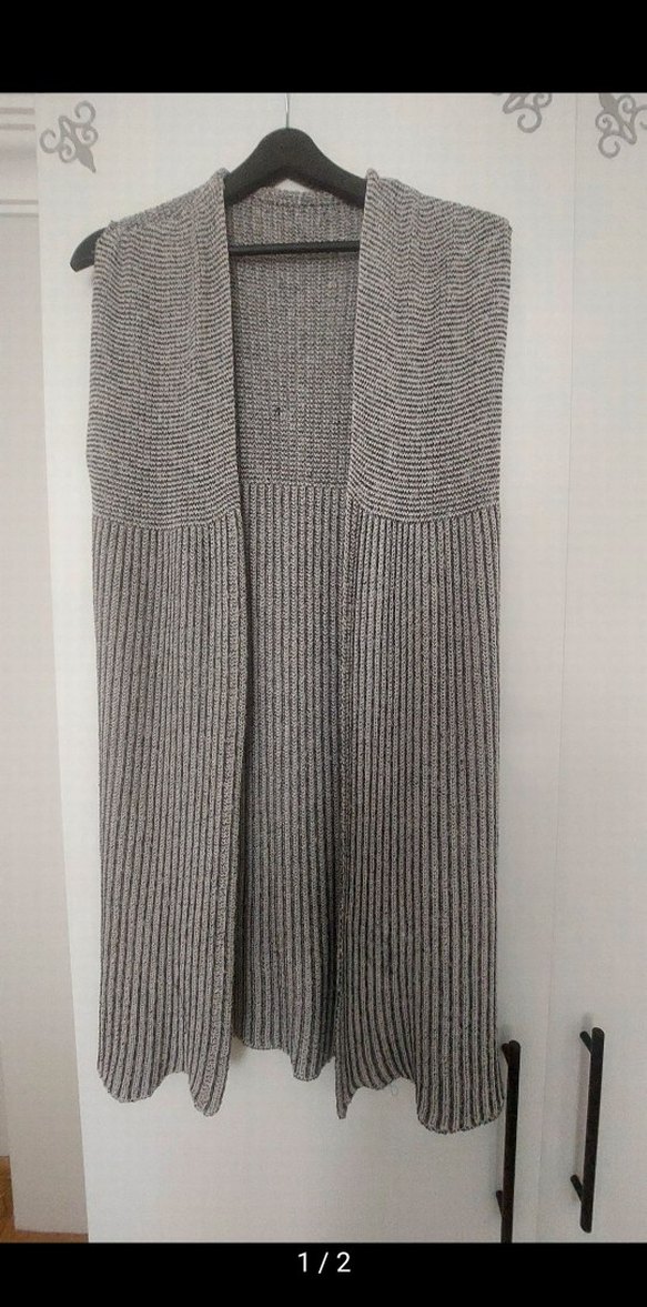 Gri renkli, notched lapel yakalı, örgü dokulu ve regular fit kesime sahip, midi uzunlukta kolsuz kadın yeleği.38-40-42 bedene uygundur