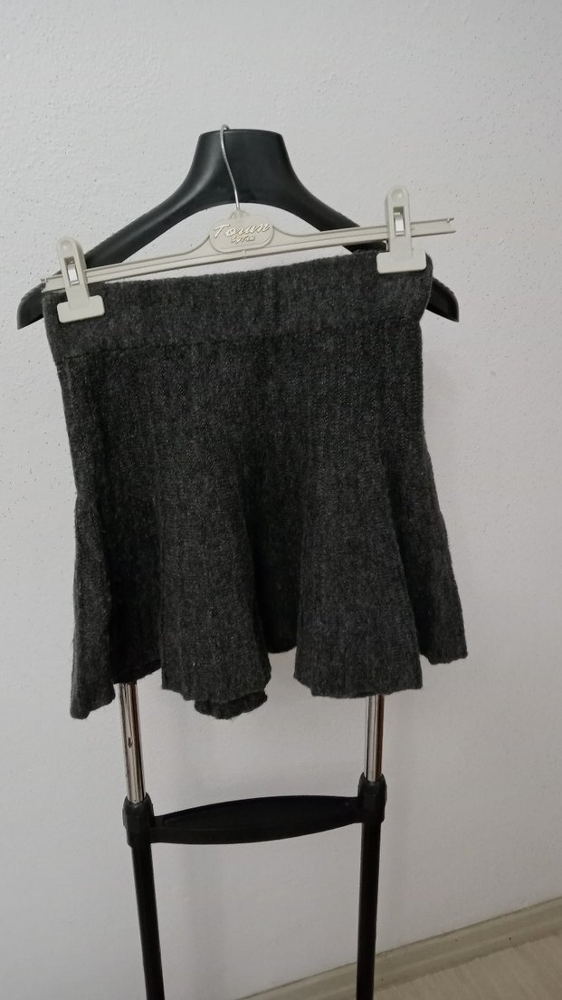 Gri renkli, örgü yün kumaştan yapılmış, bol kesim mini etek. Desensiz ve rahat, günlük sokak modasına uygun.