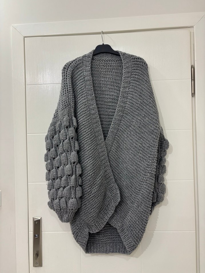 Gri renkli el örmesi kadın mini hırka, uzun kollu, yuvarlak yaka ve bol kesimdir. Kabarcıklı örgü detaylı kolları ile gündelik kullanıma uygundur.