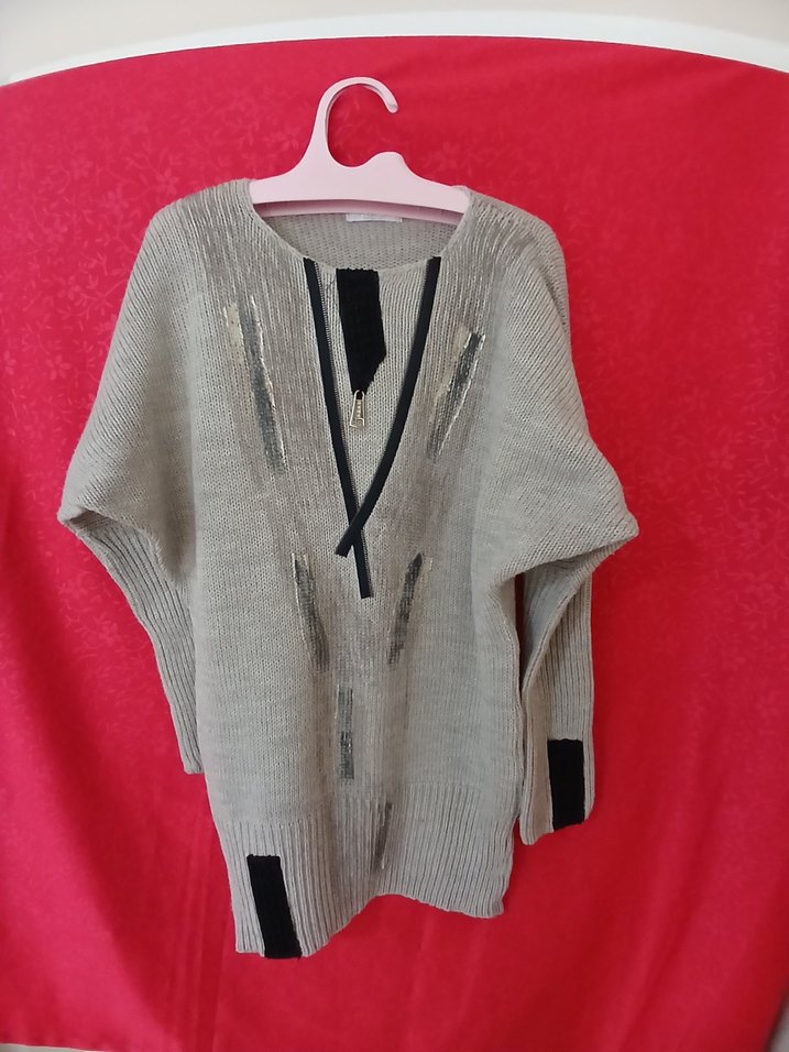 Gri örgü kadın kazak, bol kesim ve uzun kollu, V yaka ve mini boydadır. Sokak modasına uygun rahat ve şık, desensiz tasarımıyla günlük kullanım için idealdir.