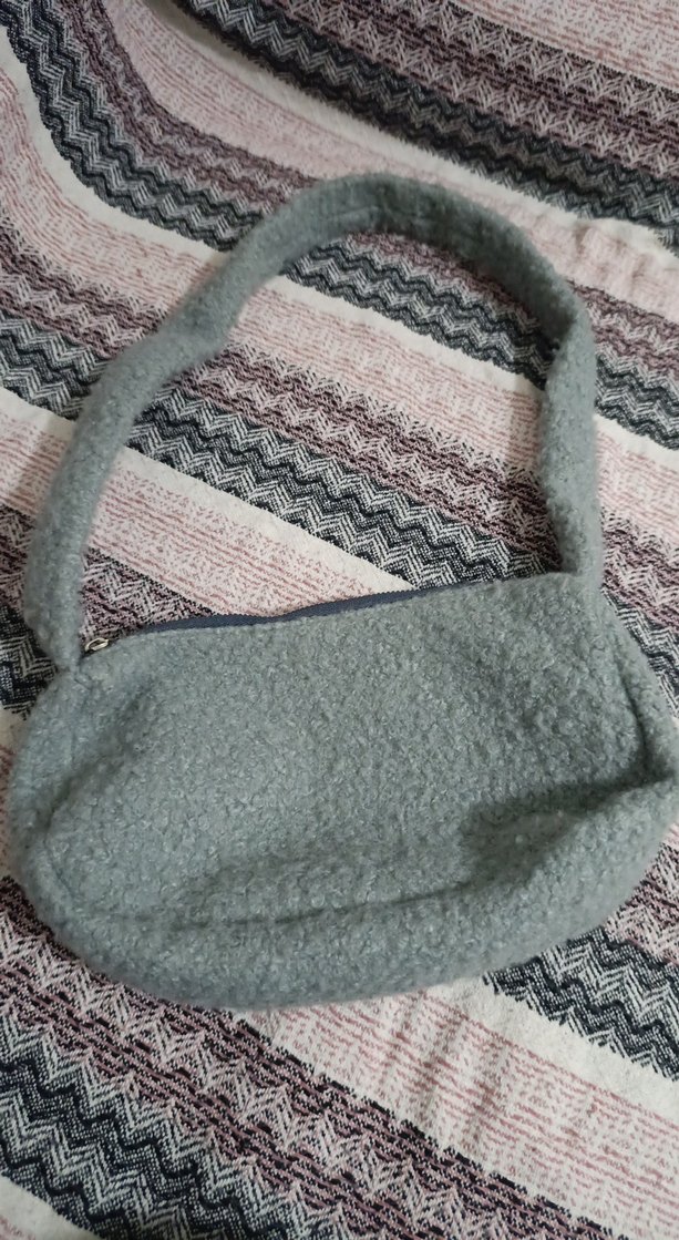 Gri örgü dokulu, yumuşak ve rahat kadın omuz çantası, günlük kullanıma uygun bohem tarzda.
