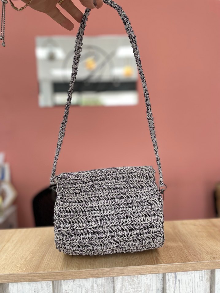 Gri örgü kadın omuz çantası, rahat ve şık sokak stili için ideal.