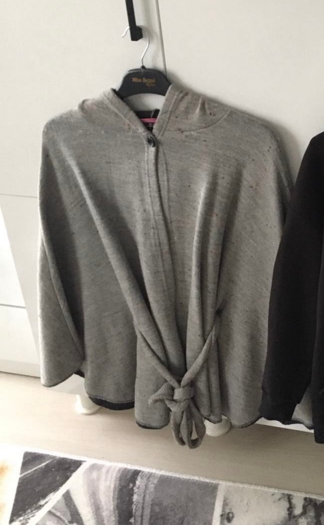 Gri örgü yün panço, midi boy, bol kesim, uzun kollu ve yuvarlak yaka, günlük rahat kullanım için uygundur.