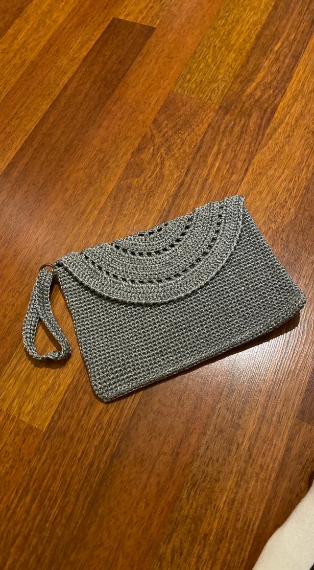 Gri renkli, örgü kumaştan yapılmış, nakış detaylı, günlük kullanıma uygun bohem tarzda kadın portföy çanta. Taşıma için bileklik askısı bulunur.