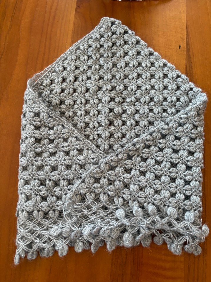 Gri renkte, örgü detaylı kadın şal. El işi çeyizlik