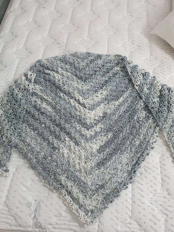 Gri renkli, örgü kadın şalı. Sade ve temel tasarıma sahip, rahat ve bohem tarzda örülmüştür.