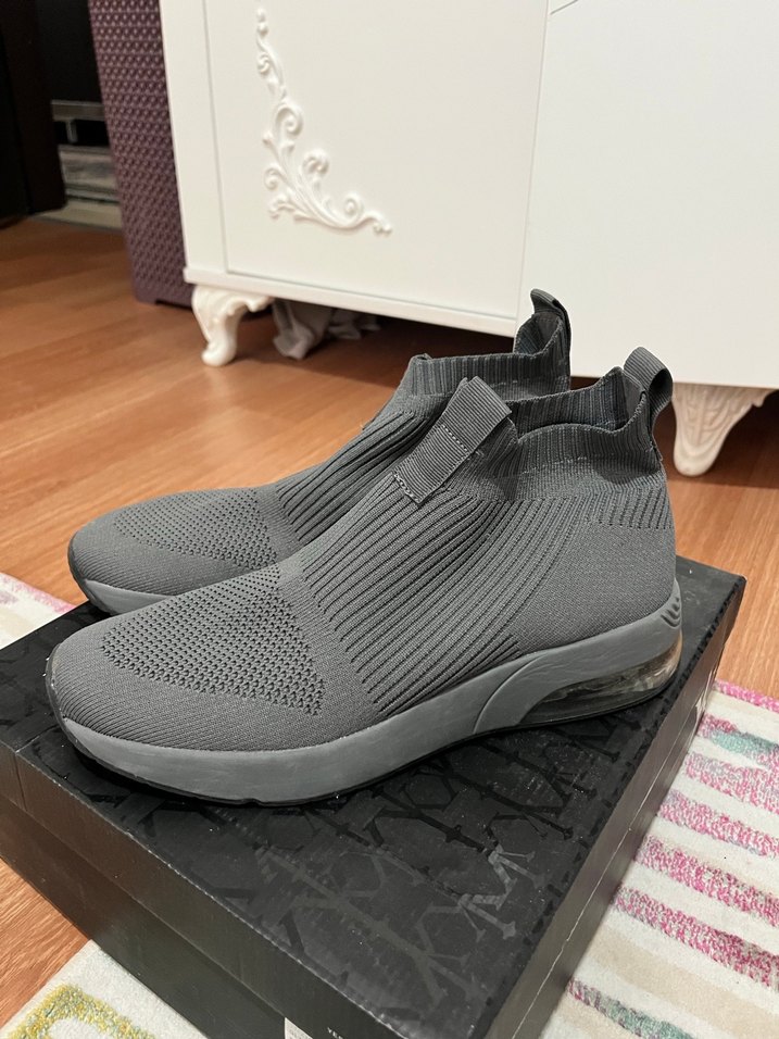 Gri örgü kadın spor ayakkabısı, kauçuk tabanlıdır. Spor ve trend sokak stili için uygundur. Ayağa yapışan stil, bedeni küçük geldiği için satıyorum. Maksimum 2 kez giyildi.