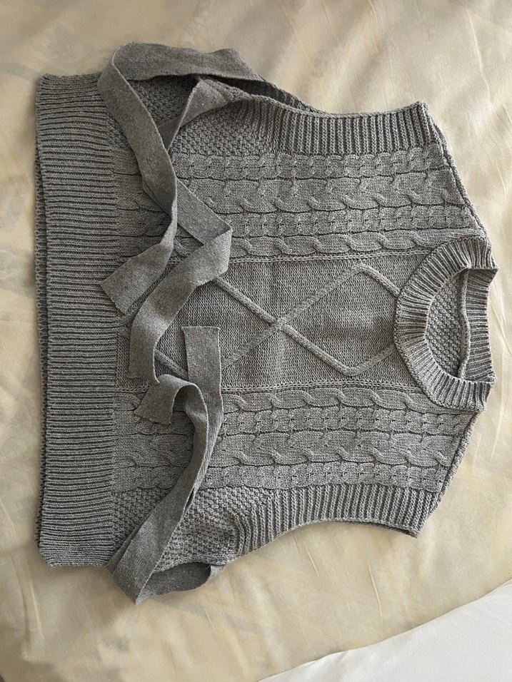 Gri renkli, örgü dokulu, boğazlı ve kolsuz, kadın süveter.