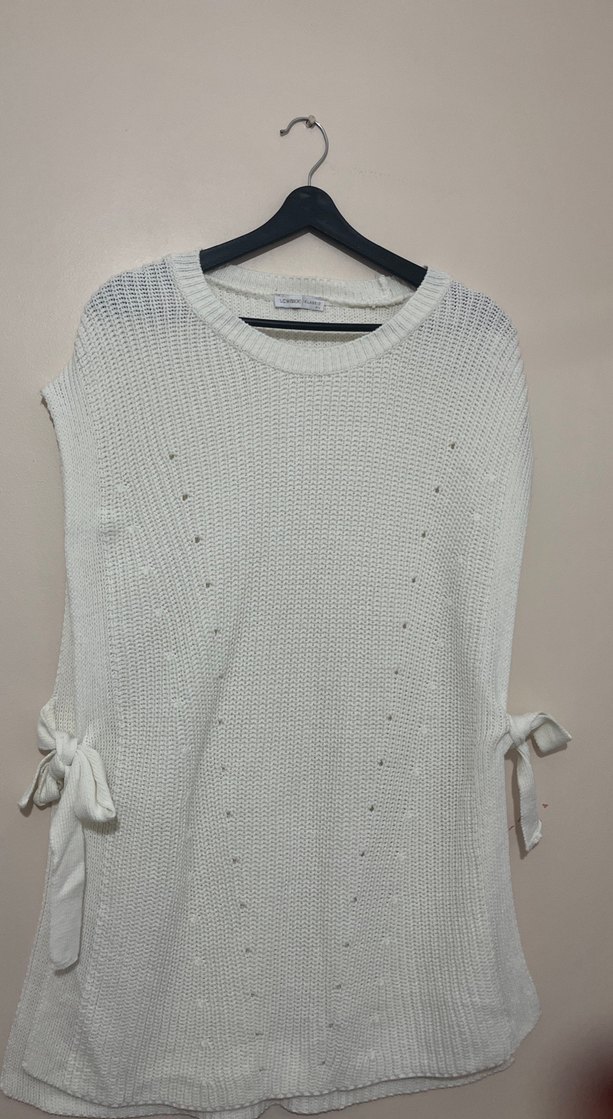 Gri renkli, örgü dokulu kadın süveter. Salaş kesim ve bisiklet yaka ile günlük kullanıma uygun, yanlarda bağcık detaylı, rahat bir sokak stili sunar.