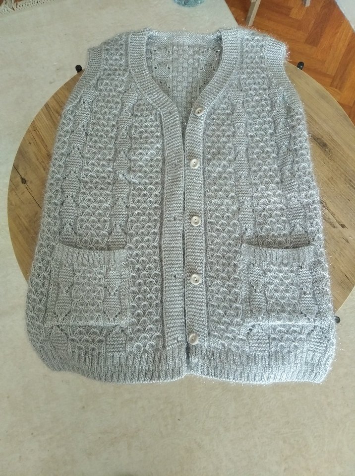 Gri renkli, örgü dokulu, kolsuz kadın süveter. V yaka ve bol kesim, ön cep detaylarıyla rahat ve bohem tarzda günlük kullanım için uygundur.