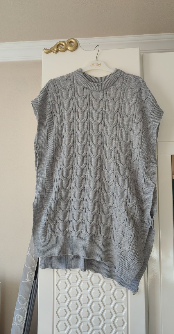 Gri renkli, yüksek yakalı ve örgü kumaştan üretilmiş, salaş kesim kolsuz süveter yelek. Günlük rahat kullanıma uygundur.