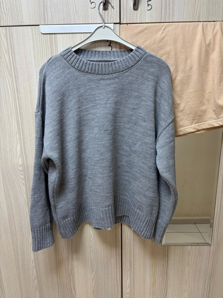 Gri renkli, örgü kadın sweatshirt, yuvarlak yaka ve uzun kolludur. Salaş kesimiyle günlük kullanıma uygundur ve sade, desensiz bir görünüme sahiptir.