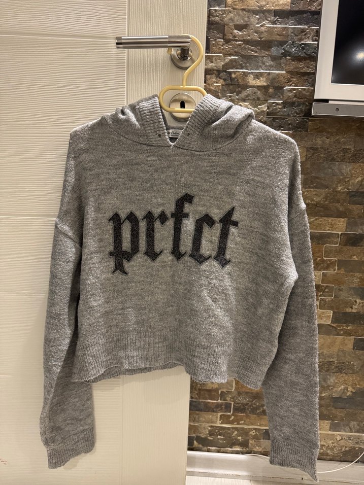 Gri örgü kadın sweatshirt, uzun kollu ve salaş kesimlidir. Önünde 'prtct' baskısı bulunur, günlük rahat tarz için uygundur.