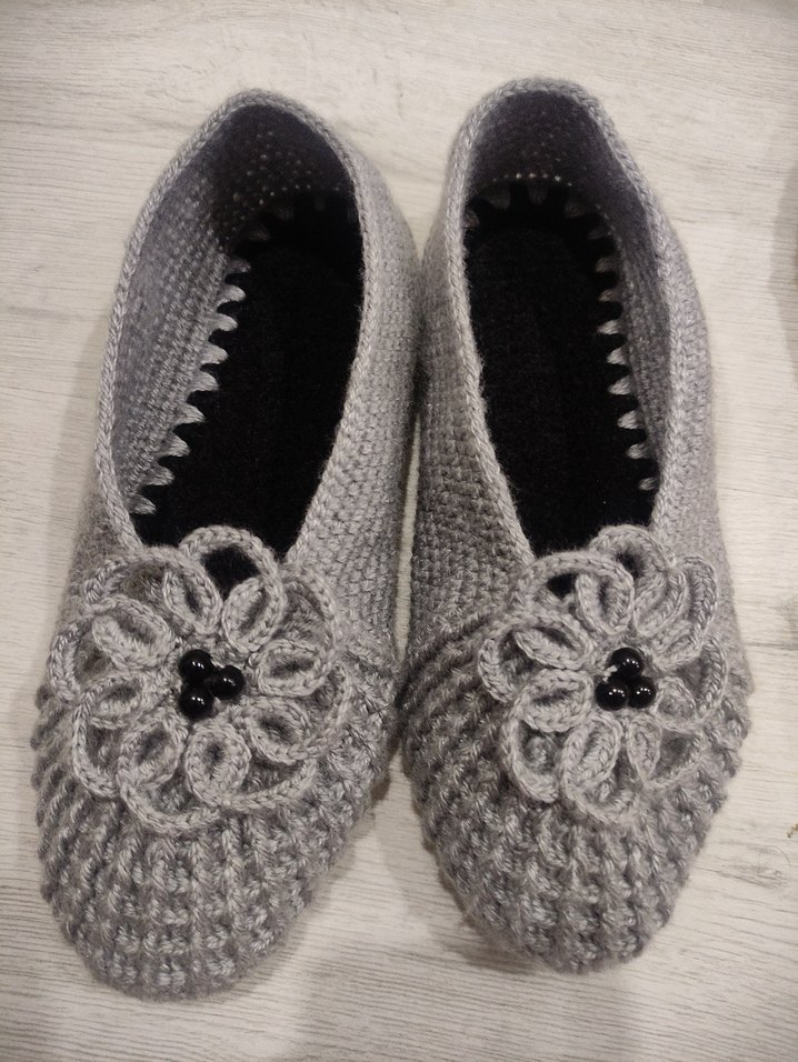 Gri örgü kumaştan yapılmış, yüksek topuklu kadın terlikleri, çiçek detaylı ve sade tasarımlıdır, günlük kullanıma uygundur.