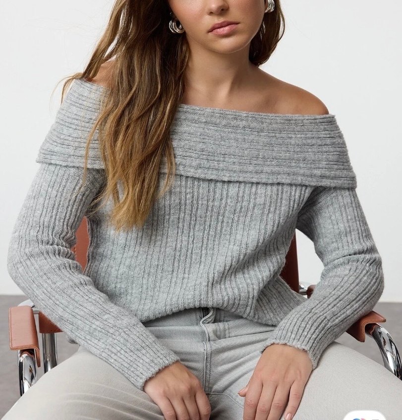 Gri renginde, örgü dokulu, kayık yaka ve uzun kollu yün kadın triko. Rahat kesimli ve normal uzunlukta, günlük kullanıma uygun. Bir kaç kez giydim hiçbir defosu yok tekliflere açığım