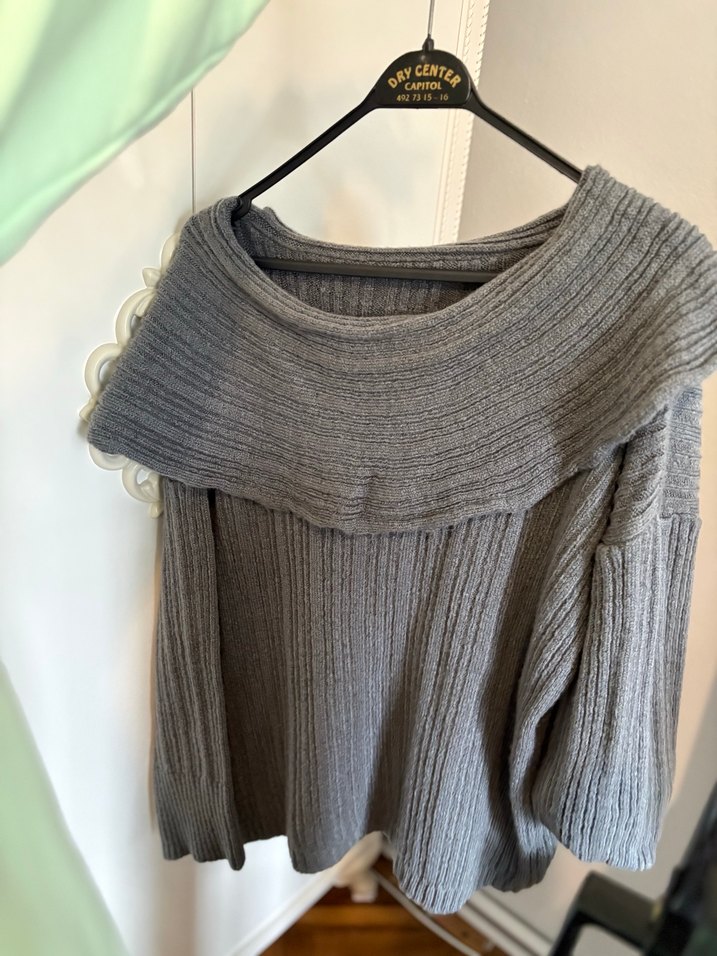 Gri örgü kadının triko bluzu, tek renk, kayık yaka ve uzun kollu, rahat kesim ve normal boyda, konforlu gündelik stil için uygun.