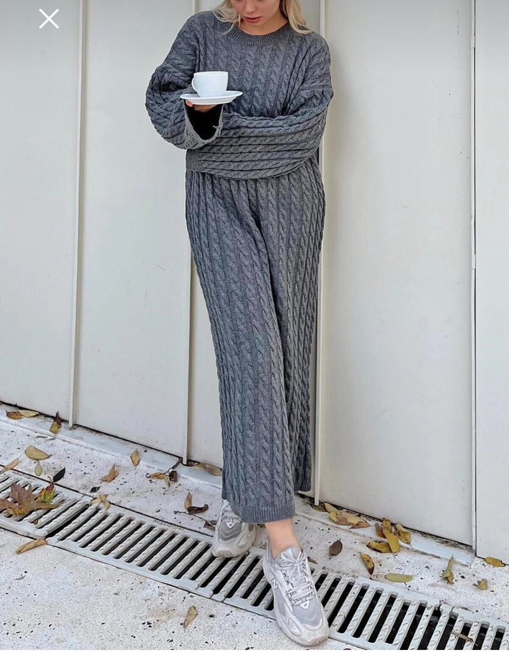 Gri örgü kumaştan uzun, bol kesim triko elbise. Bisiklet yaka ve uzun kollu, rahat ve desen içermeyen tasarım, şık günlük kullanım için uygundur.