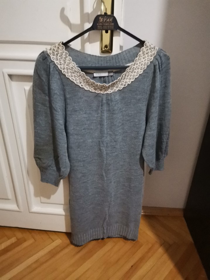 Gri renkli, dantel detaylı yuvarlak yaka ve uzun kollu örgü triko elbise. Salaş kesim ve midi boyda, bohem tarz için uygun.