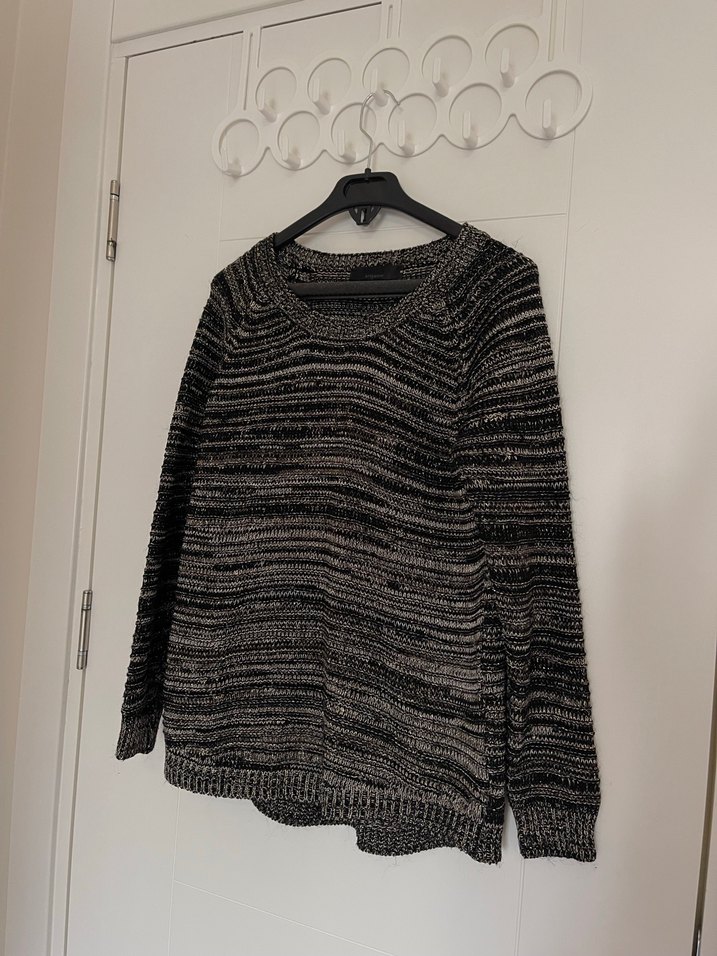 Gri renk, uzun kollu, yuvarlak yaka örgü kadın kazak. Salaş kesim ve normal boyda, rahat ve şık günlük sokak stili için uygundur.