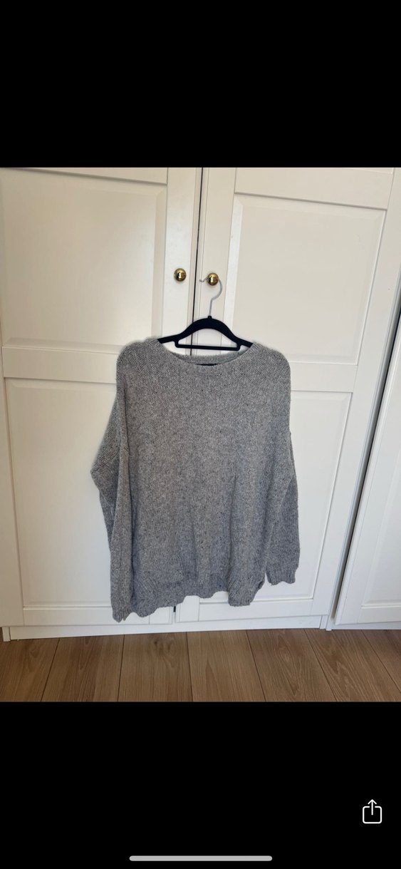 Yumuşak yünden yapılmış, uzun kollu, bisiklet yaka, gri örgü ve bol kesim kadın triko kazak. Günlük kullanıma uygundur.