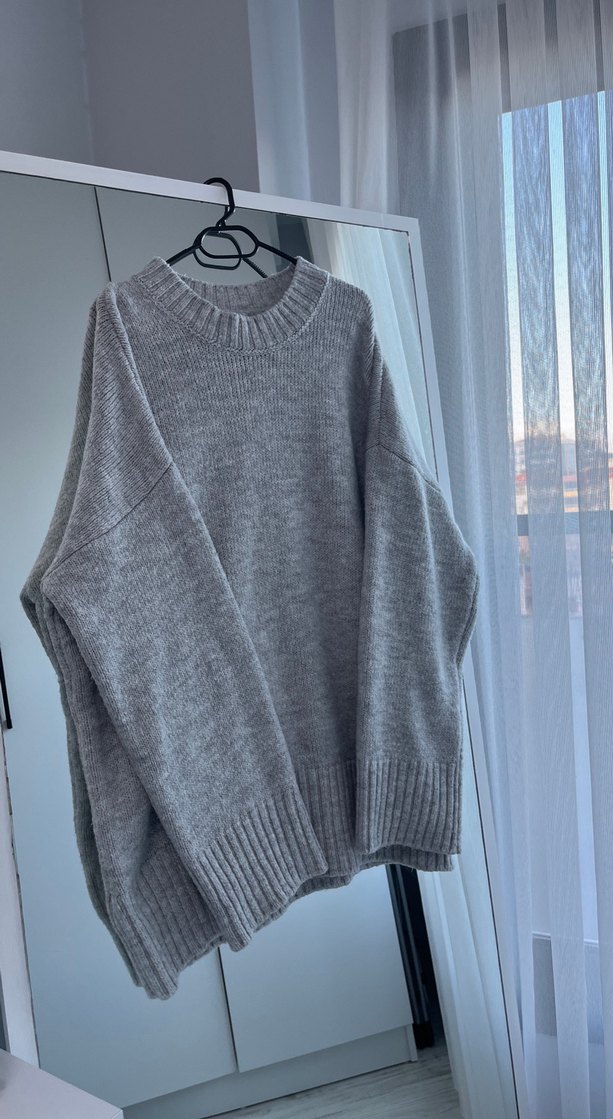 Gri renkli, örgü kumaştan, bisiklet yaka ve uzun kollu, bol kesim kadın triko kazak. Rahat ve günlük kullanım için uygundur. Standart beden