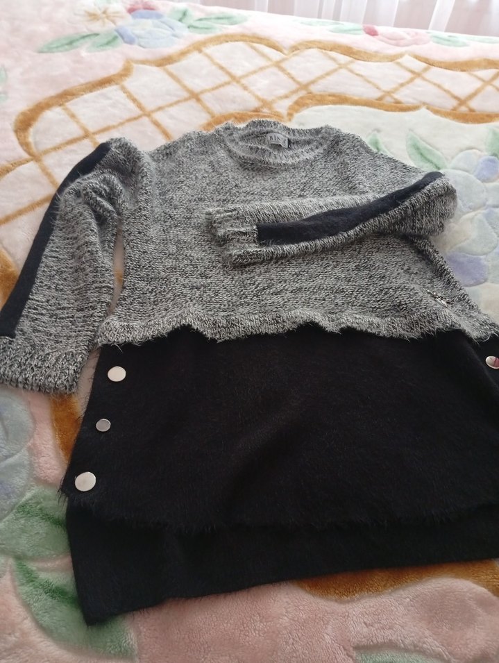 Gri renkli, uzun kollu, yuvarlak yaka, örgü kadın triko kazak. Rahat ve bol kesim, günlük kullanıma uygun sade tasarım. hiç kullanılmadı