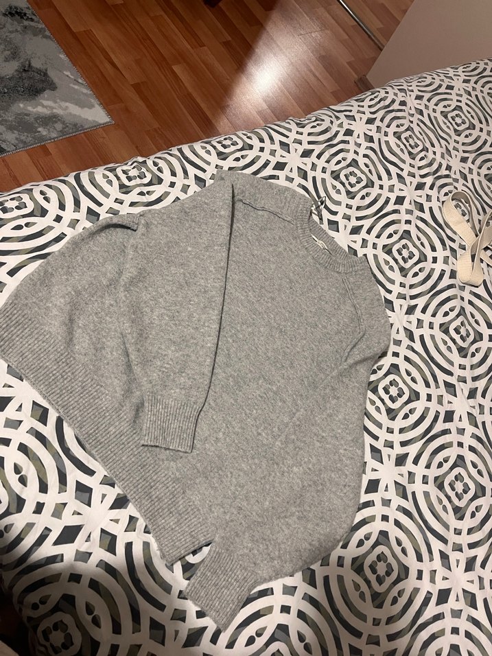 Gri renkli, uzun kollu ve bisiklet yaka örgü yün kadın triko kazak. Rahat ve salaş kesim, günlük kullanıma uygun.