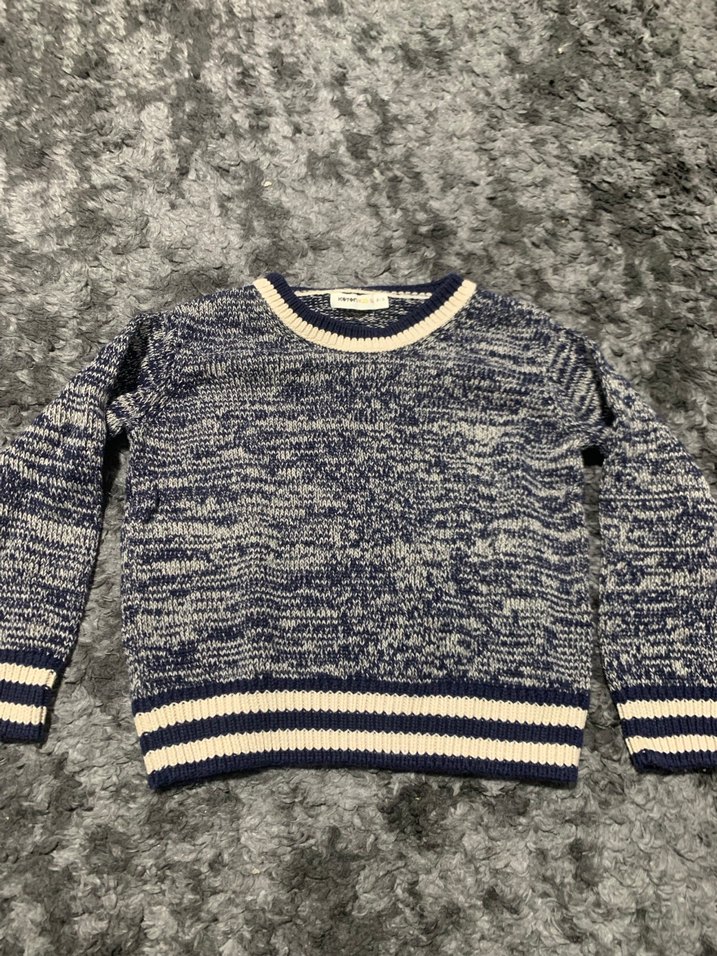 Gri renkli, örgü dokulu, uzun kollu ve yuvarlak yakalı kadın triko kazak. Salaş kesimi ve çizgili manşetleri ile günlük kullanıma uygundur.