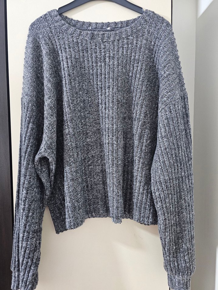 Gri renkli, uzun kollu, yuvarlak yakalı örgü triko kazak. Rahat ve bol kesimli, günlük kullanıma uygun sade tasarım.