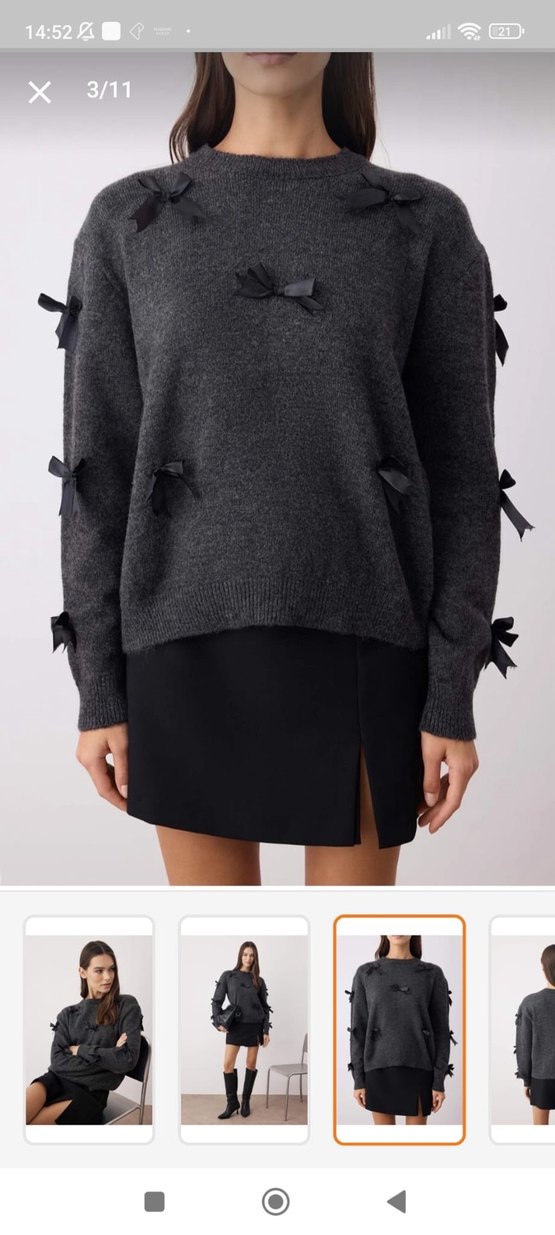 Geniş kesim, uzun kollu gri örgü triko kazak, goth tarzı küçük fiyonk detaylarıyla dikkat çeker. Günlük kullanıma uygundur.