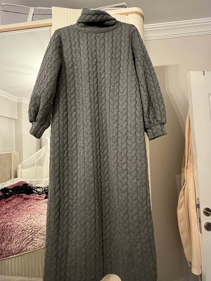 Bu uzun gri örgü elbise, yüksek yaka ve uzun kolludur. Rahat ve bol kesimiyle gündelik kullanıma uygundur, sade ve konforlu bir tarza sahiptir.
