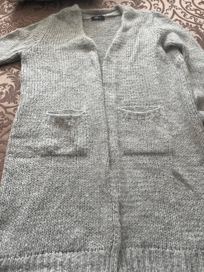 Gri renkli, uzun kollu ve bol kesim örgü kadın hırka. Cepleri ve yakasıyla rahat ve sade bir tasarıma sahiptir.