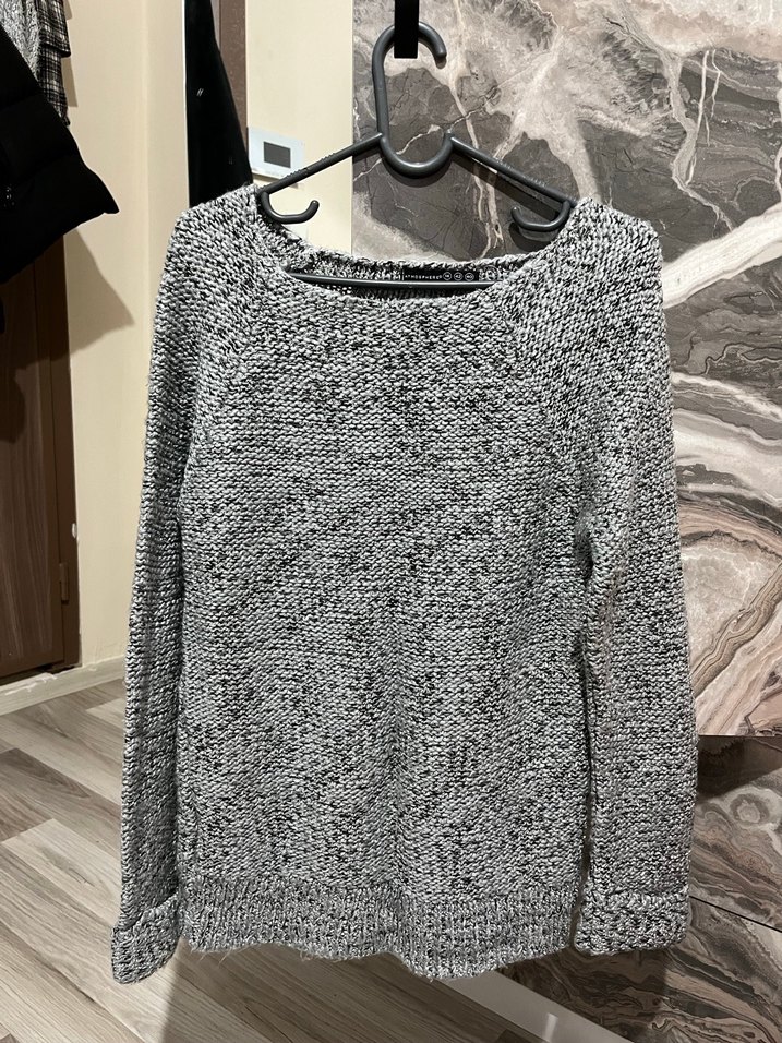 Gri örgü kumaştan, uzun kollu, yuvarlak yakalı ve salaş kesimli, midi boyda kadın kazak.