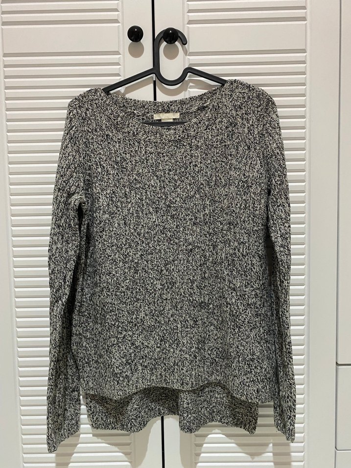 Bu kadın kazak, bol kesim, uzun kollu ve yuvarlak yaka özelliklerine sahiptir. Yumuşak yün kumaştan örülmüş, gri renkte ve günlük kullanım için uygundur.