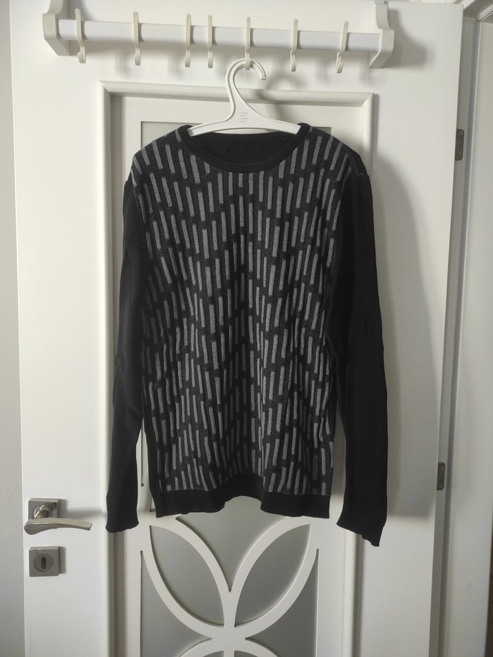 Gri örgü kumaştan, uzun kollu ve bisiklet yakalı, salaş kesim kadın kazak. Minimalist ve desensiz, günlük kullanıma uygun.
