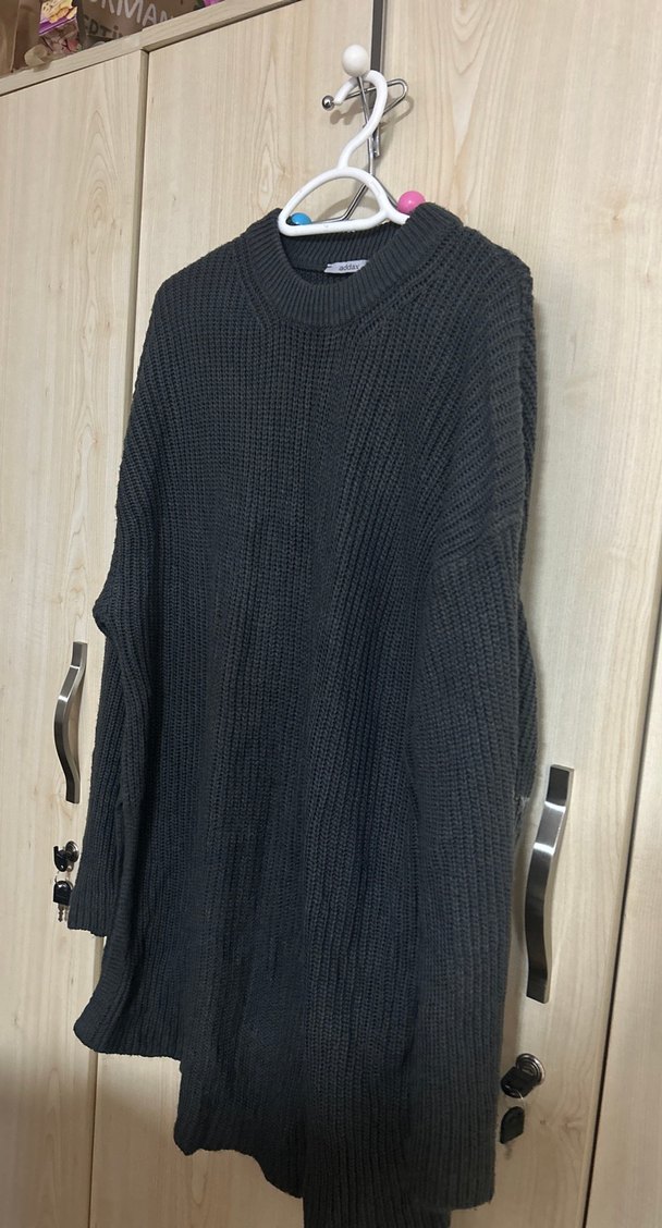 Gri renkli, örgü kadın kazak, yuvarlak yaka ve uzun kolludur. Rahat kesimi ve midi boy uzunluğu ile konforlu bir görünüm sunar.