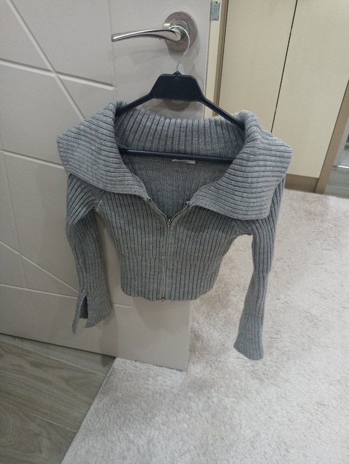 Geniş yakalı, yarım fermuarlı gri örgü kazak. Uzun fitted kollu ve kısa boylu, rahat ve şık günlük kullanım için idealdir.