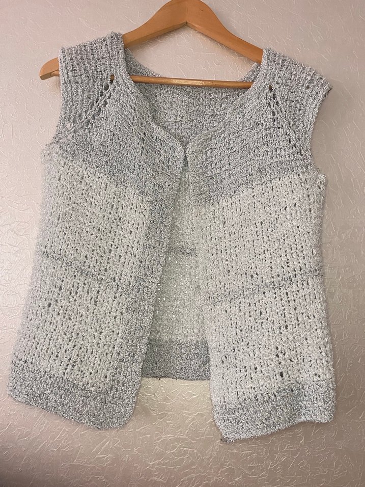 Gri renk, kolsuz, el örgüsü kadın yelek.
