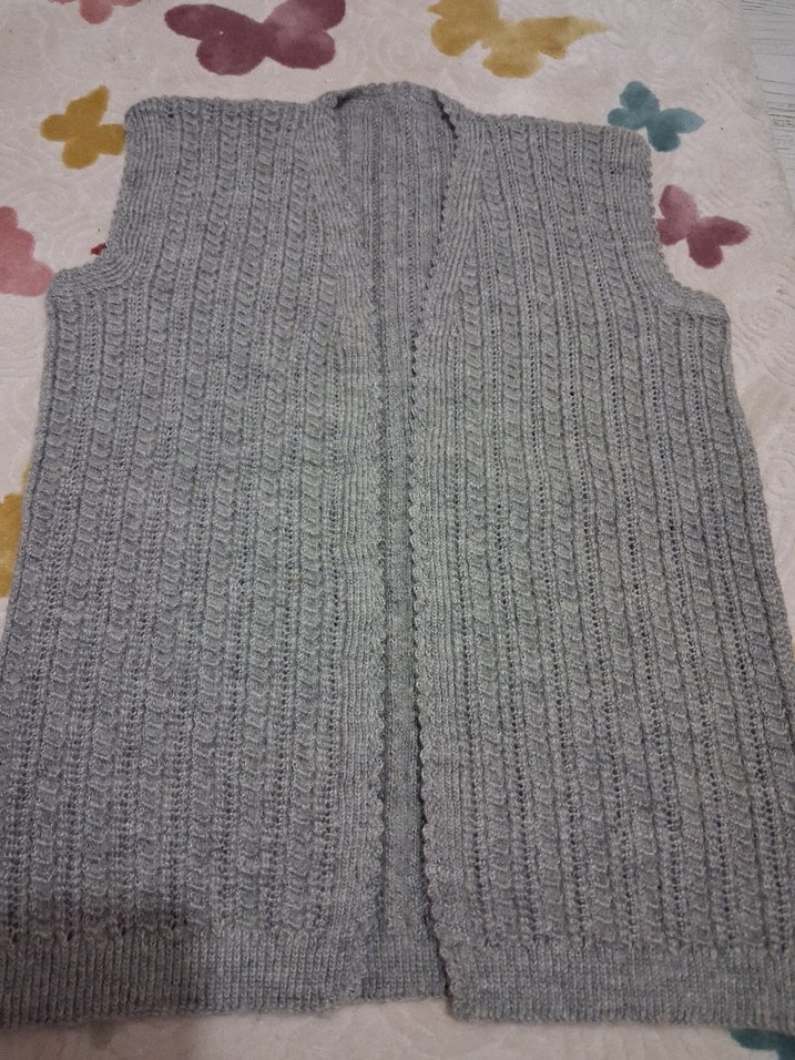 Gri renkte, V yaka, örgü kumaştan yapılmış, kolsuz, normal boyda ve rahat kesim kadın süveter. Günlük kullanıma uygundur. el örgüsü yün yelek. sıfır çeyizlik ürünlerdir #örgüyelek. #çeyizlikelörgüsüyelek