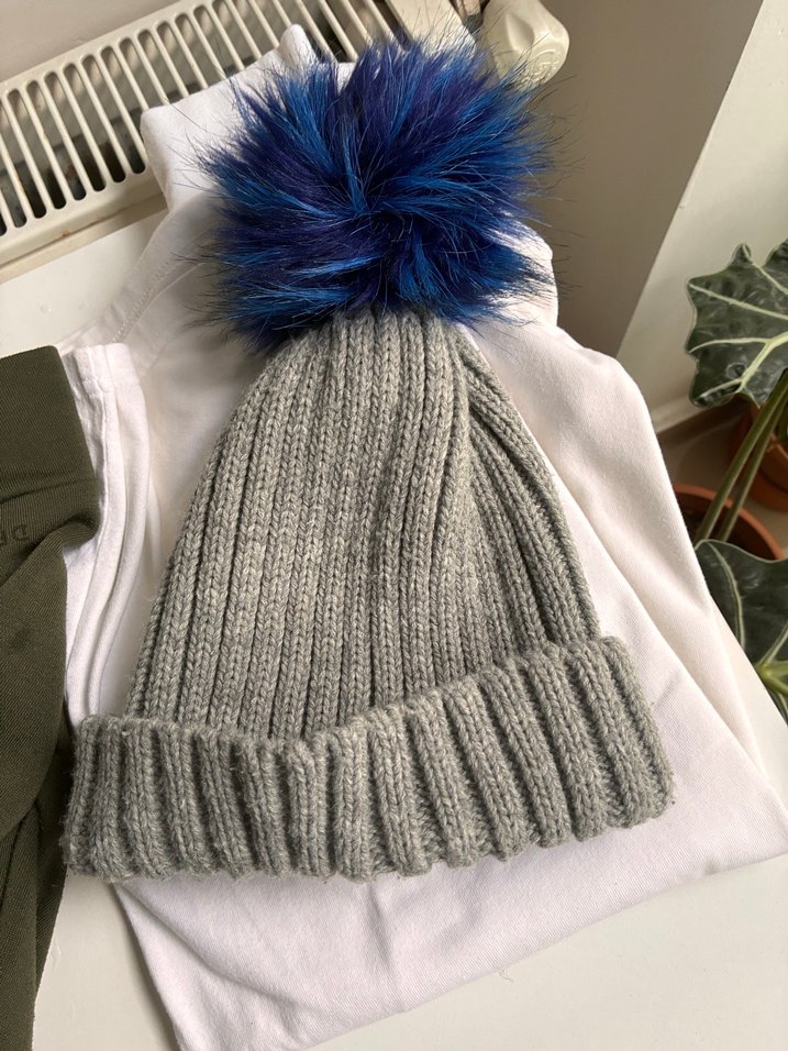 Yumuşak yünden örülmüş gri kadın bere, büyük mavi sahte kürk ponpon ile rahat ve sokak modasına uygun.