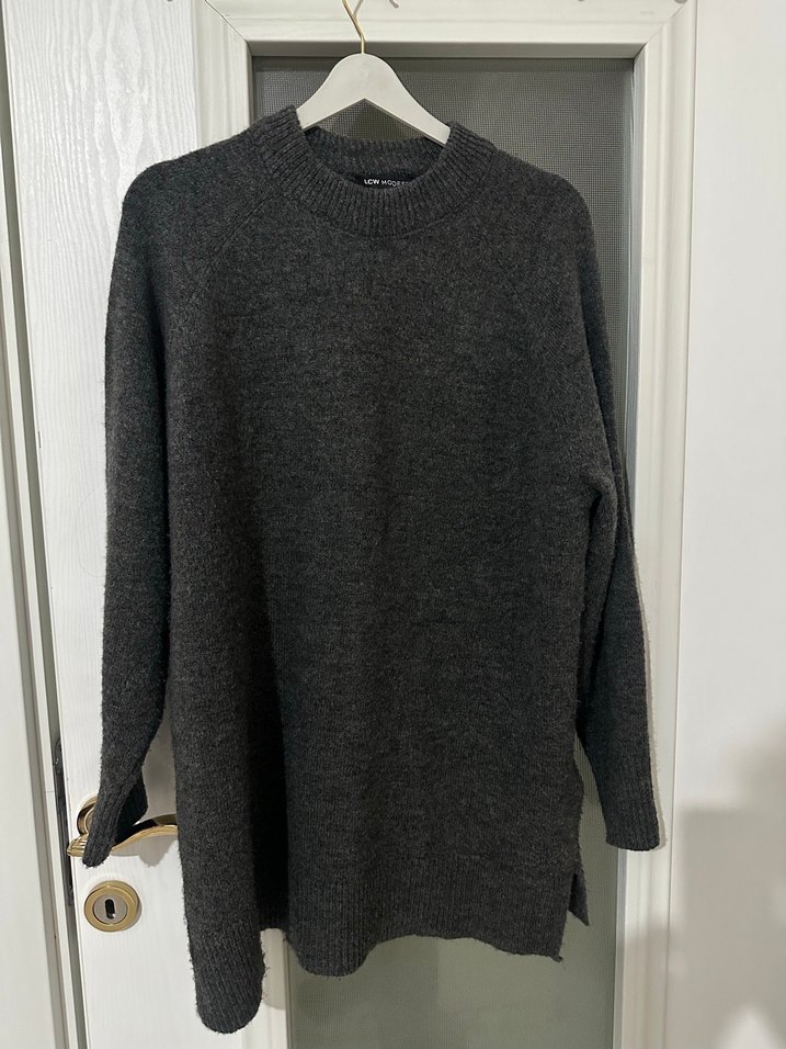 Gri örgü yün kazak, bisiklet yaka ve uzun kolludur. Bol kesim ve normal midi boydadır, gündelik kullanım için uygundur.