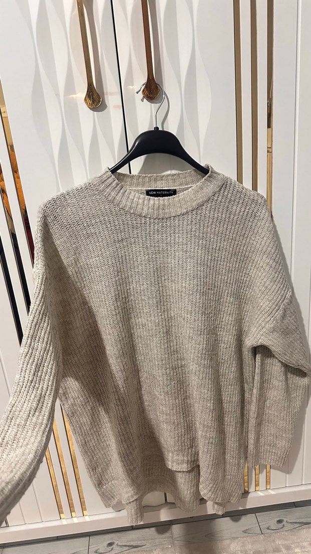 Gri renkli, örgü yün kumaştan, yuvarlak yakalı ve uzun kollu, rahat kesim normal midi uzunluğunda kadın kazak.