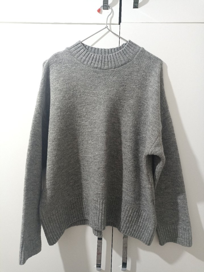 Gri renkli, örgü yün kumaştan yapılmış kadın kazak. Bisiklet yaka ve uzun kolludur, bol kesim ve normal midi boydadır. Rahat günlük kullanım için uygundur.